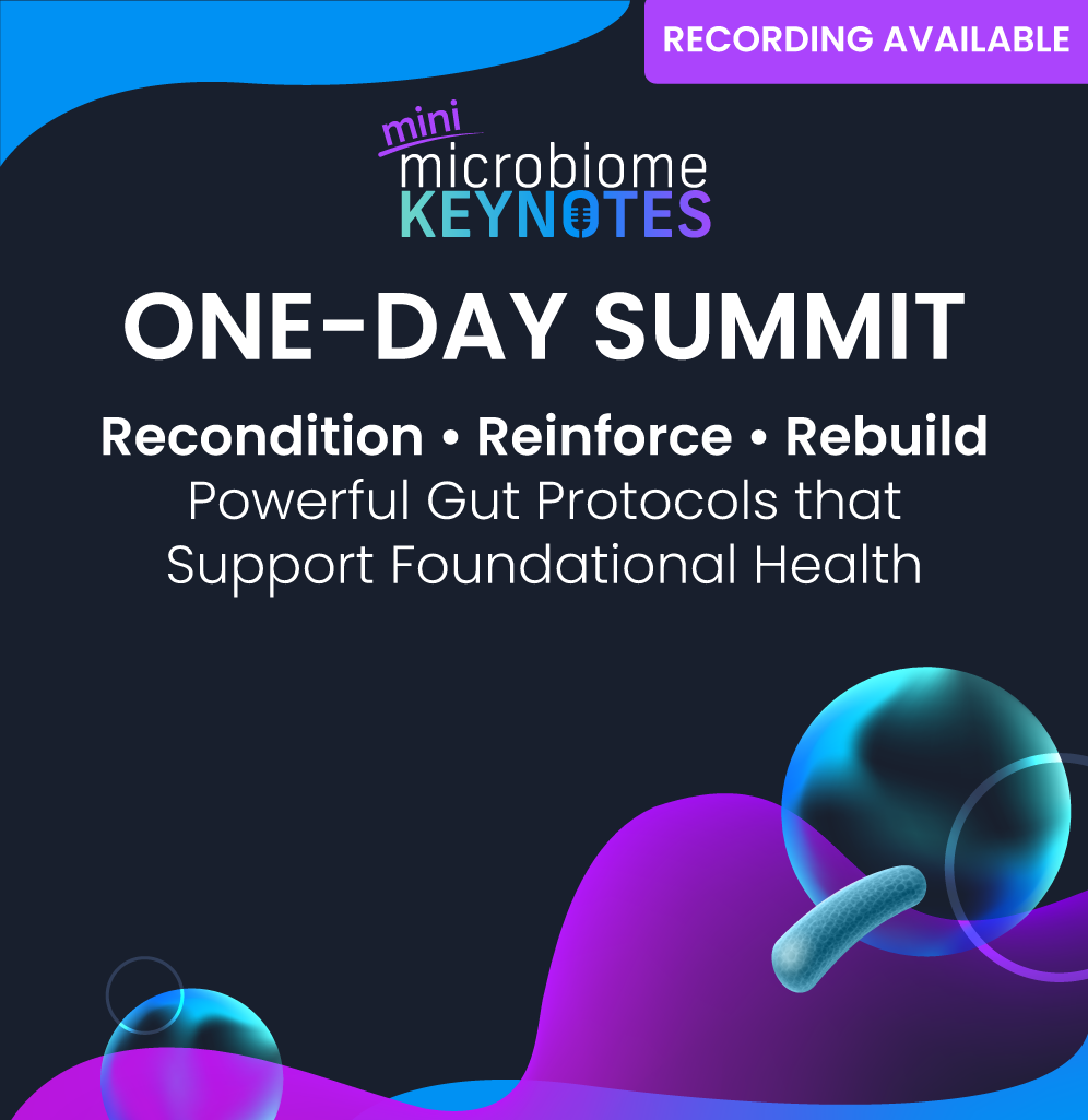 Join us on June 23rd for our second Mini-Keynotes One-Day Summit to enhance the foundation of your gut health knowledge. Prebiotics, probiotics, microbes, and more will be covered in depth—and backed up by research!